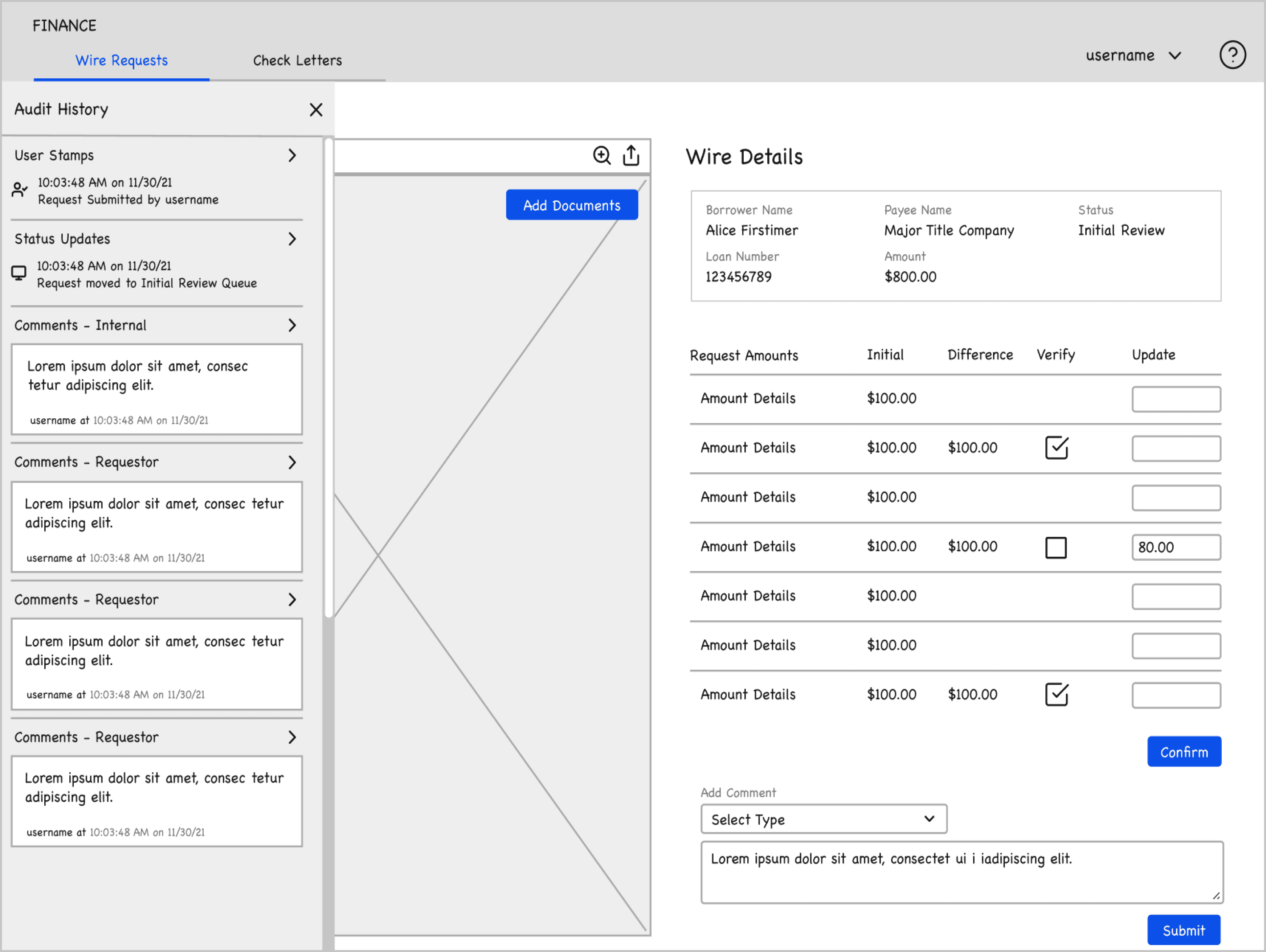 After collaborating with other internal teams to utilize the data available from our other in-house platforms, we developed a solution that enabled users to only review line items in wires when the internal system showed a discrepancy—significantly reducing the amount of time a team member would need to review each wire, while drawing attention directly to problems. As part of this solution, an audit history panel would allow the wire requestor and approver to communicate directly within the platform with a history of these comments and all major events for visibility across roles. A major quality-of-life feature we implemented is the embedded PDF reader, eliminating the need for users to download wire PDFs to view them. Testing with this set of prototyped wireframes was met with resounding positivity and some areas for improvement—as a result of testing, we adjusted the hierarchy of information displayed and decided that allowing customization of the experience for each role was necessary for the MVP.